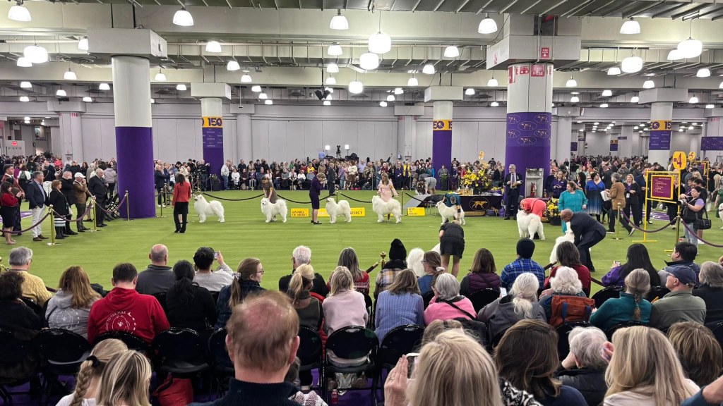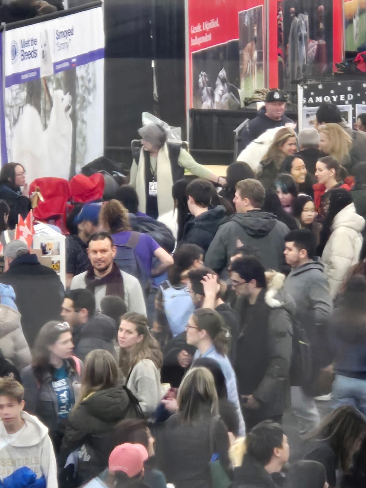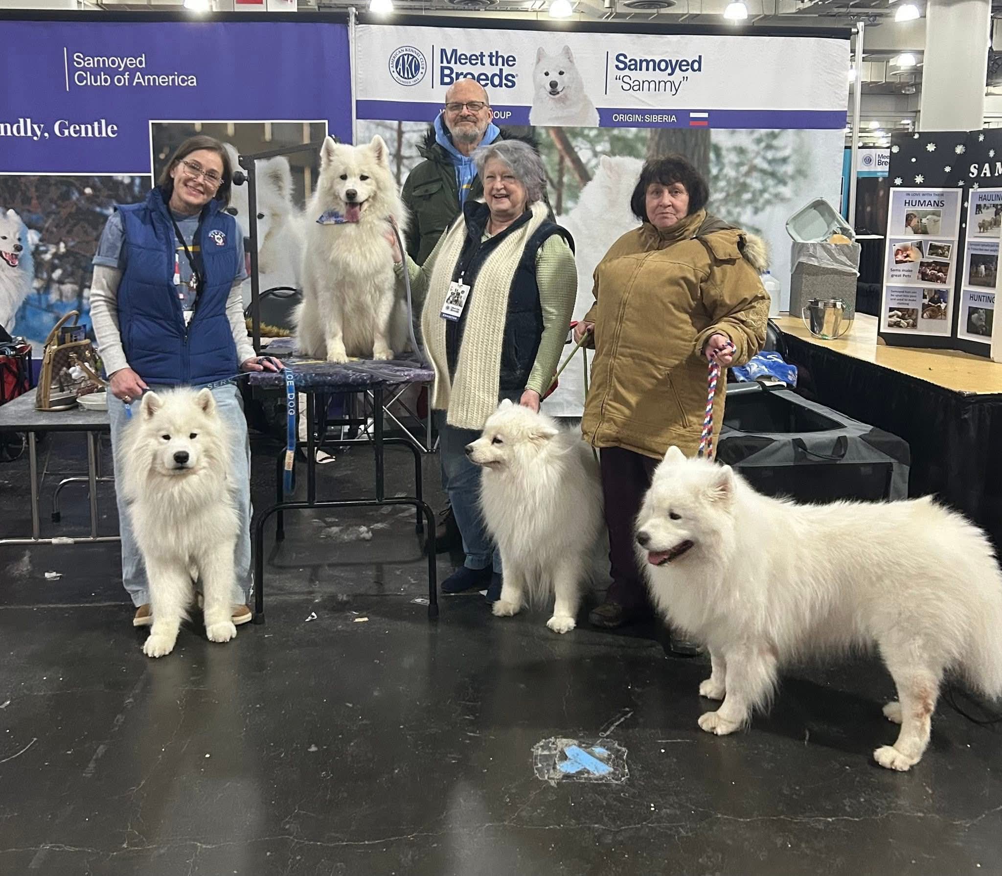 The Minuteman Samoyed Club recently represented the breed at the AKC MEET THE BREED in New York City. Members and their dogs had one of the most popular booths there, with crowds often standing ten deep for a chance to meet and pet one of the many young Samoyeds who were just as eager to be snuggled by the visitors.
